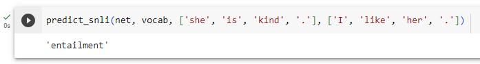 predict_snli 함수는 이 두 문장을 입력으로 받아 모델을 사용하여 논리적 관계를 예측하고, 예측된 결과를 반환합니다. 예를 들어, 이 코드를 실행하면 전제와 가설 사이의 관계를 예측하여 "entailment" (유추) 또는 "contradiction" (모순) 또는 "neutral" (중립) 중 하나의 결과를 반환할 것입니다.