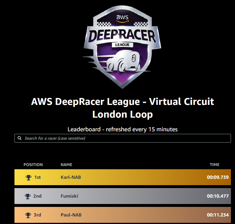 참고로 AWS Deepracer League - Viertual Circuit London Loop 수상자들의 기록은 다음과 같다.