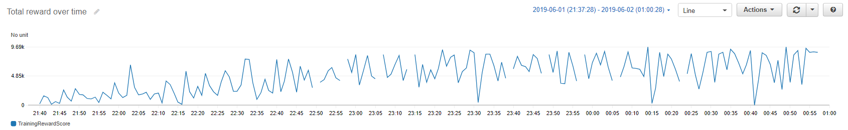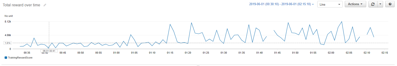 한 30분 쯤 지나면서 부터 높은 reward가 나오기 시작했다.