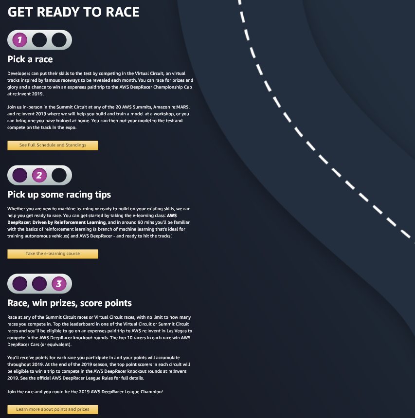 Summit Circuit 레이스 또는 Virtual Circuit 레이스에서 경쟁하십시오. 경쟁하는 레이스 수에는 제한이 없습니다. Virtual Circuit 또는 Summit Circuit 레이스 중 하나만이라도 1등을 하면 라스베가스에서 열리는 AWS re:Invent에서 열리는 AWS DeepRacer final round에 참가하는 경비를 지원받으실 수 있습니다. 각 레이스의 10등까지는 AWS DeepRacer 자동차를 받으실 수 있습니다.
