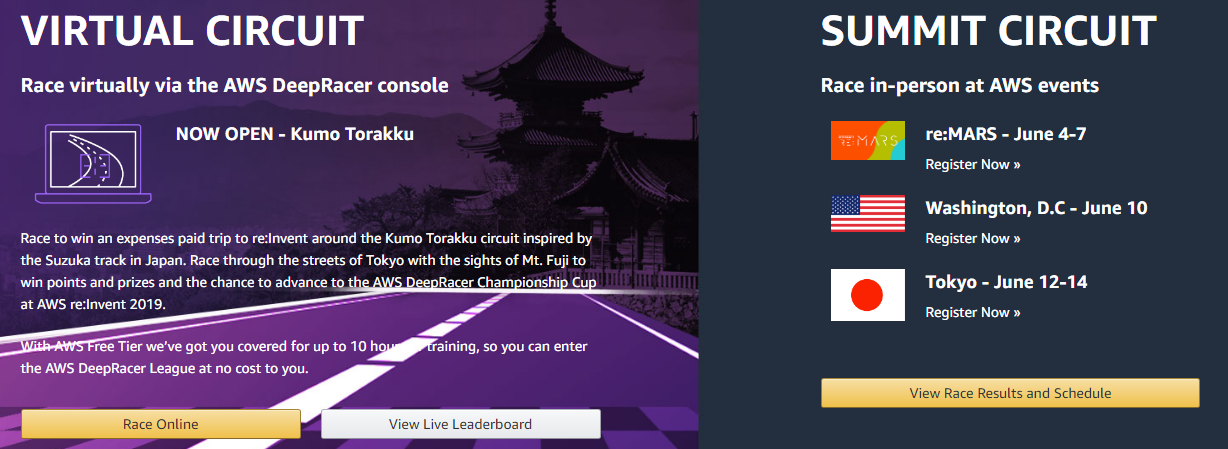 일본의 스즈카 트랙에서 영감을 얻은 Kumo Torakku 서킷 레이싱에서 우승해 re:Invent로 가는 경비 지원을 받으세요. 후지산을 보며 도쿄의 거리를 달려 승리하세요. 그리고 포인트와 상금을 획득하세요. 그리고 AWS re:Invent 2019에서 열리는 AWS DeepRacer Championship Cup 출전권도 받으세요.