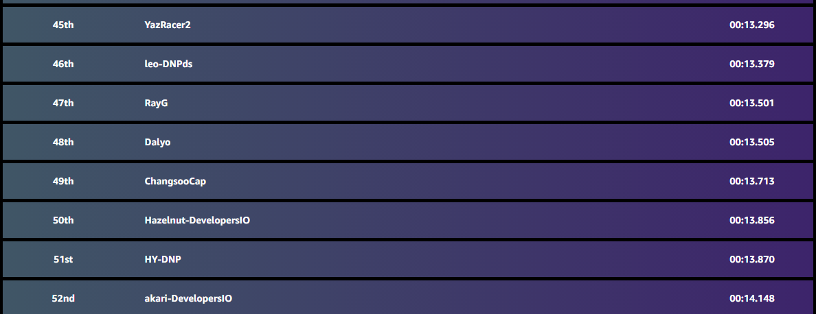 뭔가 내가 만든 벽을 허물어 뜨릴 수 있었던 경험이었고 그래서 다시 용기를 내서 모델을 새로 만들고 훈련 시켜서 대회에 내 보냈더니 나도 13초 대를 기록 할 수 있었다.