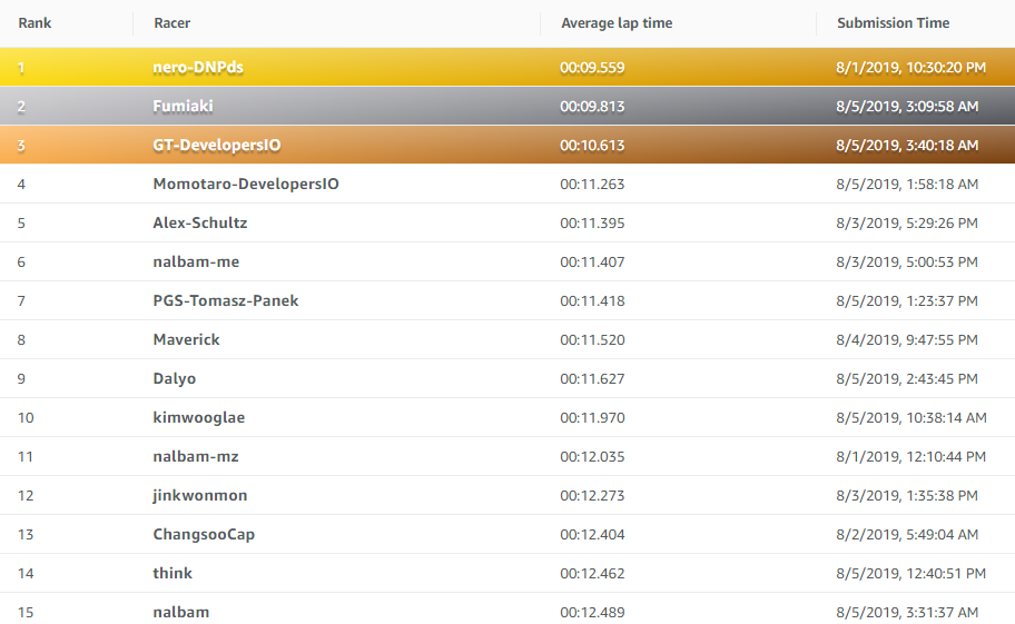 We hope you enjoyed your racing experience and will back to continue to climb the leaderboard for a chance to win a trip to the re:Invent and compete for the 2019 Championship Cup.