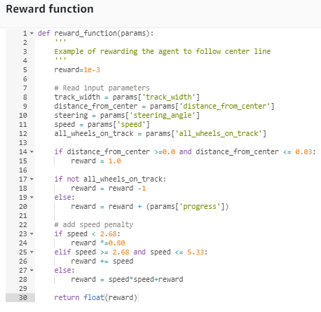 그리고 두번째는 reward_function인데.... 아래 보는 것 처럼 나는 중앙선 유지 그리고 모든 바퀴가 트랙 안에 있도록 reward를 주는 것을 기본으로 하고...
