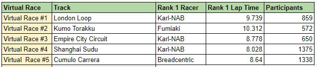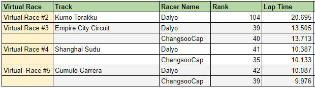 오늘 끝난 Virtual Race #5 에서는 9.976초를 기록해 39등을 차지 했다.