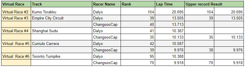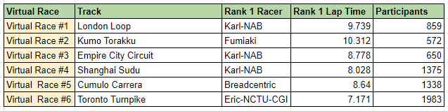 Anyway, 이번 11월 Vertual Race 목표는 9.5 초 이내 Lap Time과 50등 이내 기록이다.
