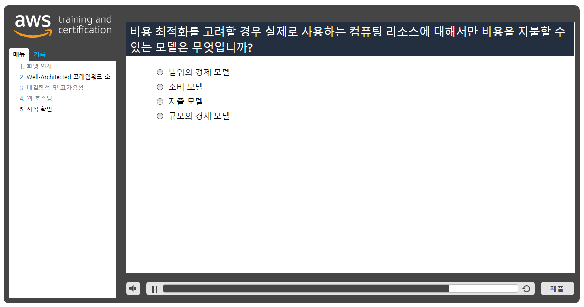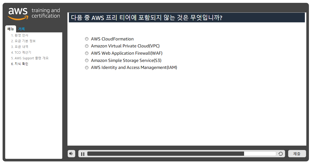· 섹션 1에서는 클라우드의 가치와 AWS 클라우드 채택에 따른 이점들을 이해하였습니다.