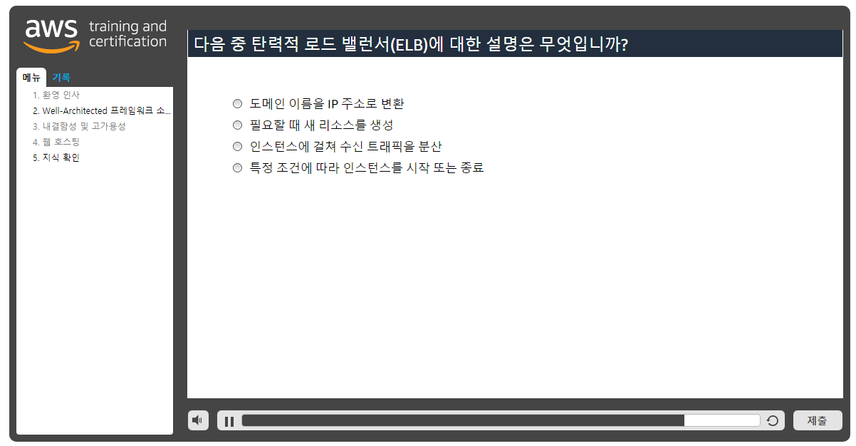 · 섹션 4에서는 Well Architected Framework를 포함하는 AWS 아키텍처 설계와 웹 호스팅의 내결함성 및 고가용성을 위한 참조 아키텍처에 대해 살펴보았습니다.