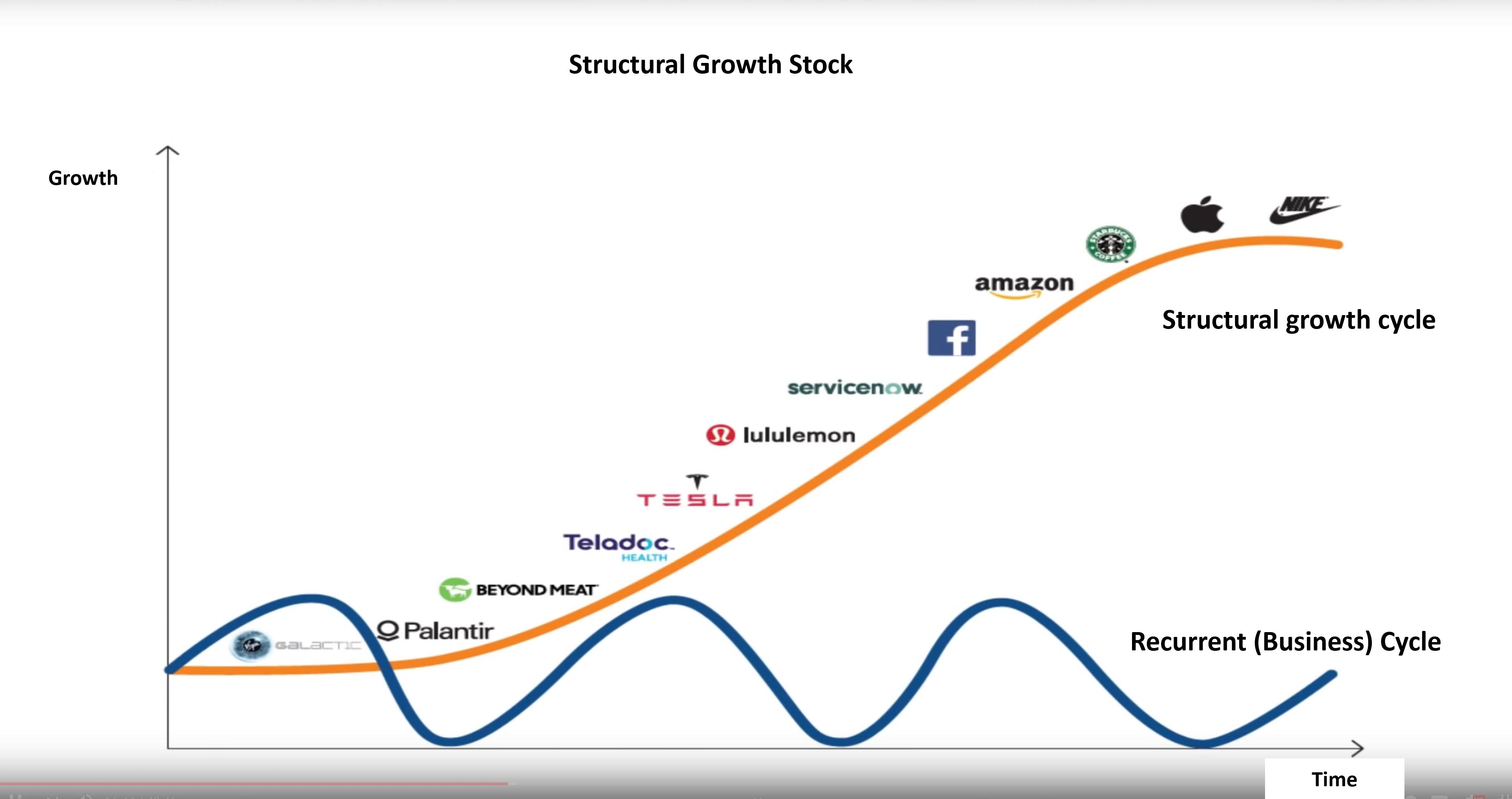 NIKE, APPLE, Starbucs, Amazon and Facebook in the upper right corner of the graph are structural growth stocks that everyone knows.