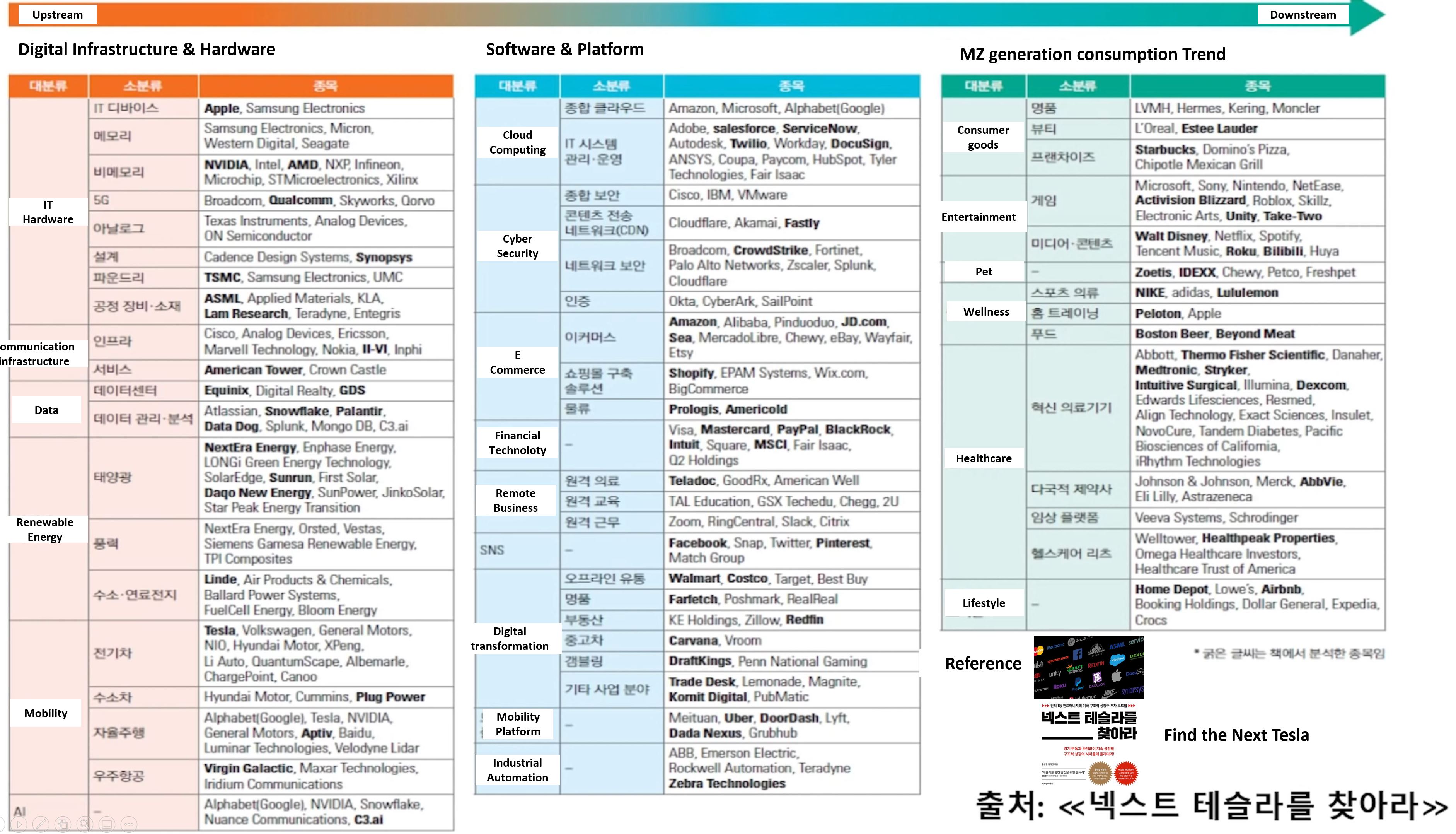 He tells you to keep two things in mind when deciding which stocks to invest in the future. One is the digital economy and the other is the consumption trend of the MZ generation. On the basis of these two, this table summarizes the stocks for each field selected by Mr. Hong.