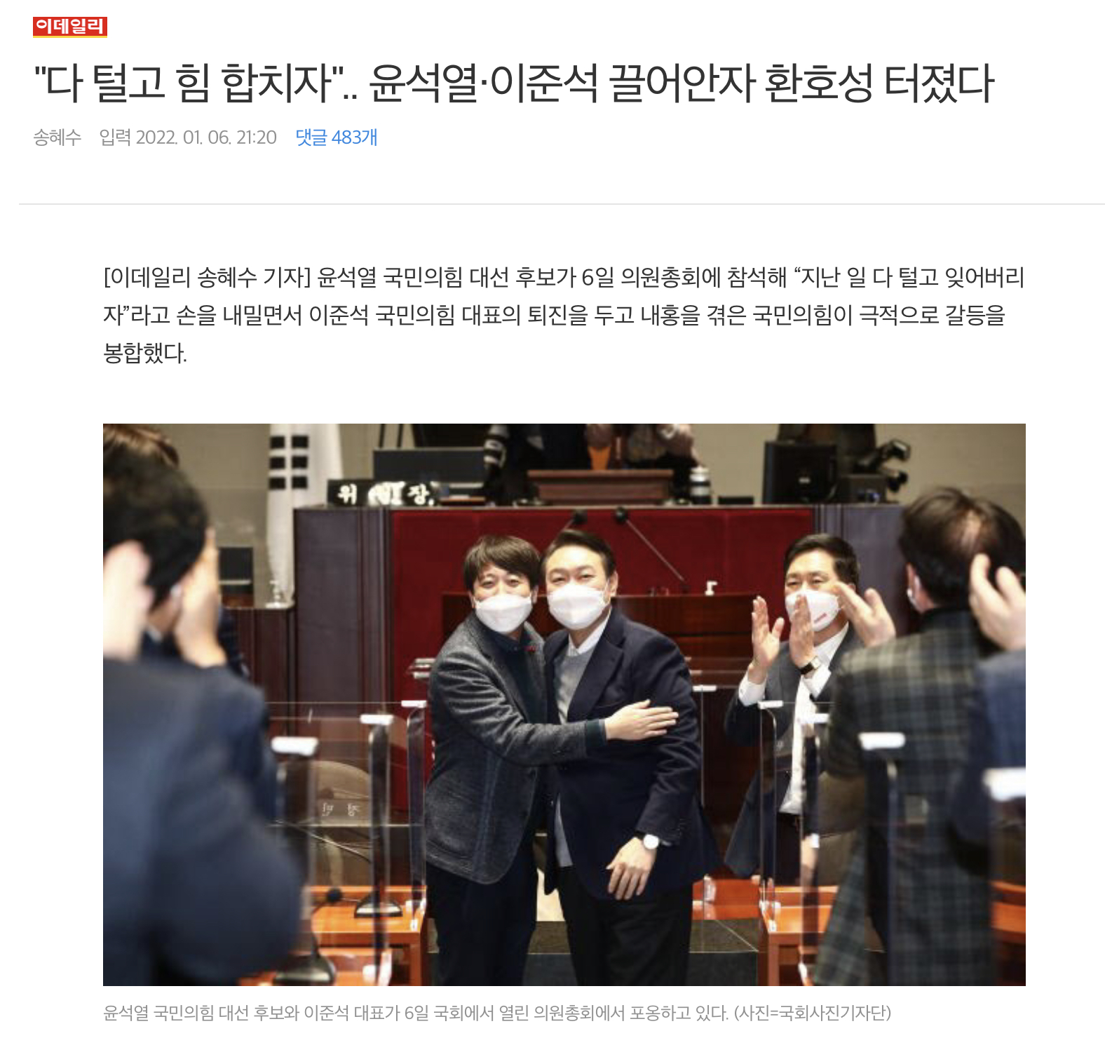 바로 윤석열이 싸우고 있는 국민의 힘 의총장에 들어가서 이준석과 함께 가자고 외치는 거였다.
