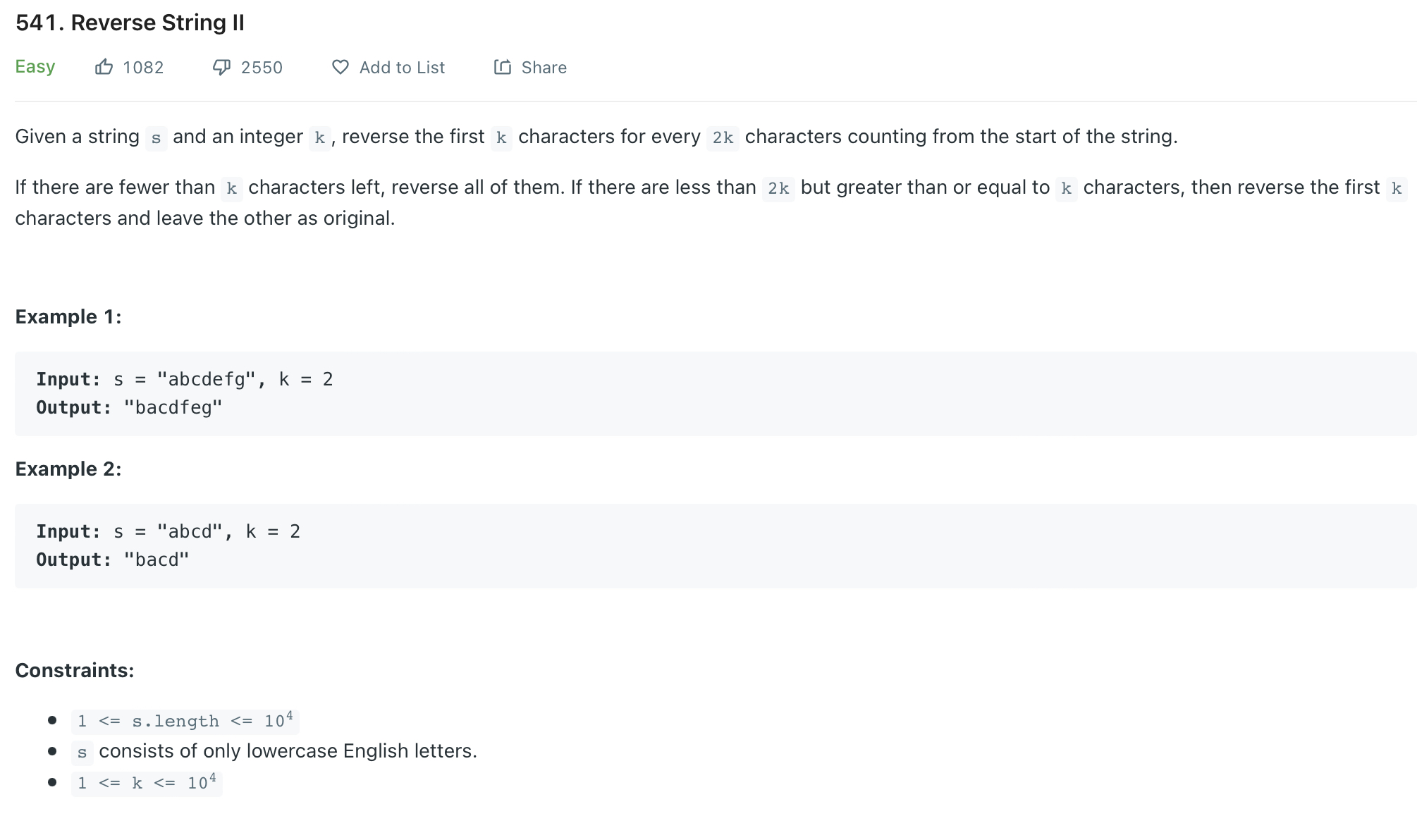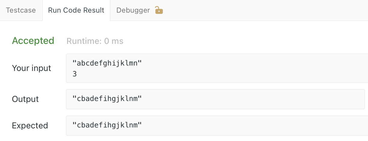 ==> 메소드 이름은 reverseStr이고 입력값으로 스트링 s , int k 를 받는다. return 값은 String이다.