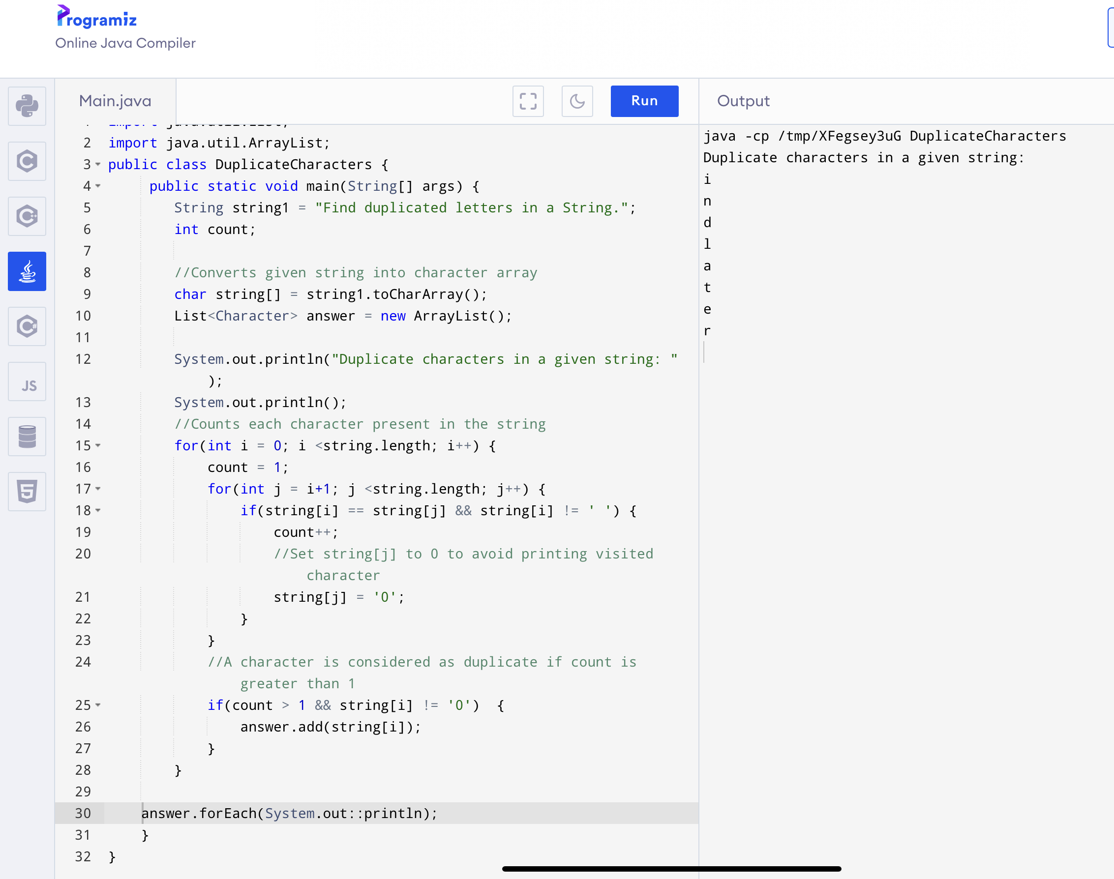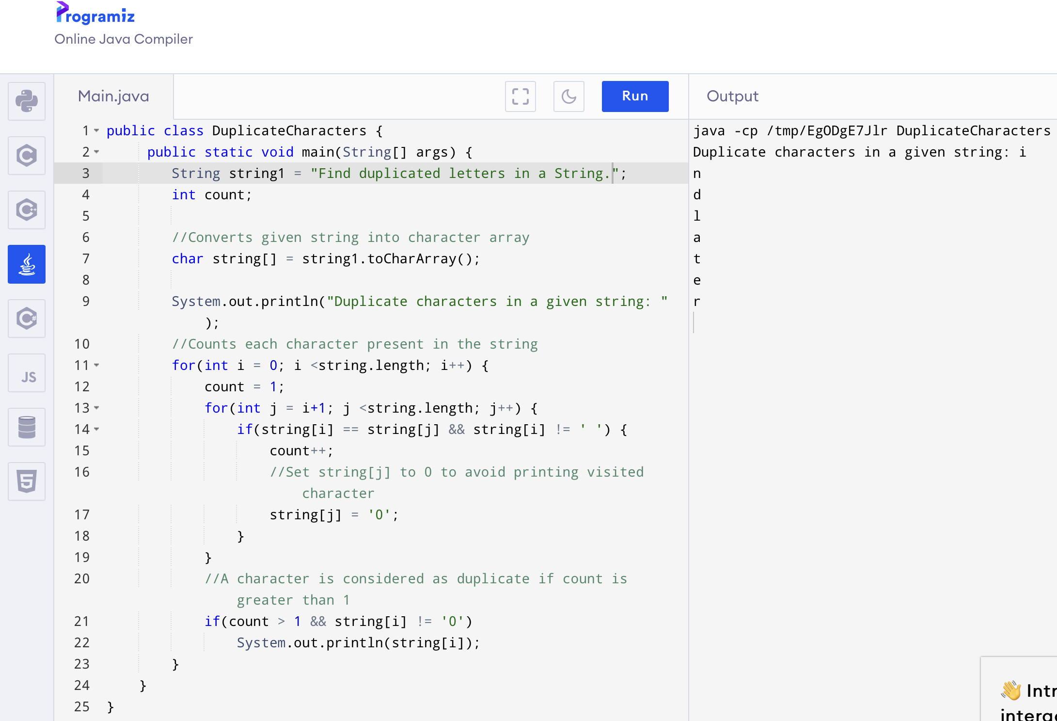 String string1 = "Find duplicated letters in a String."; // 이게 입력 되는 스트링이다.