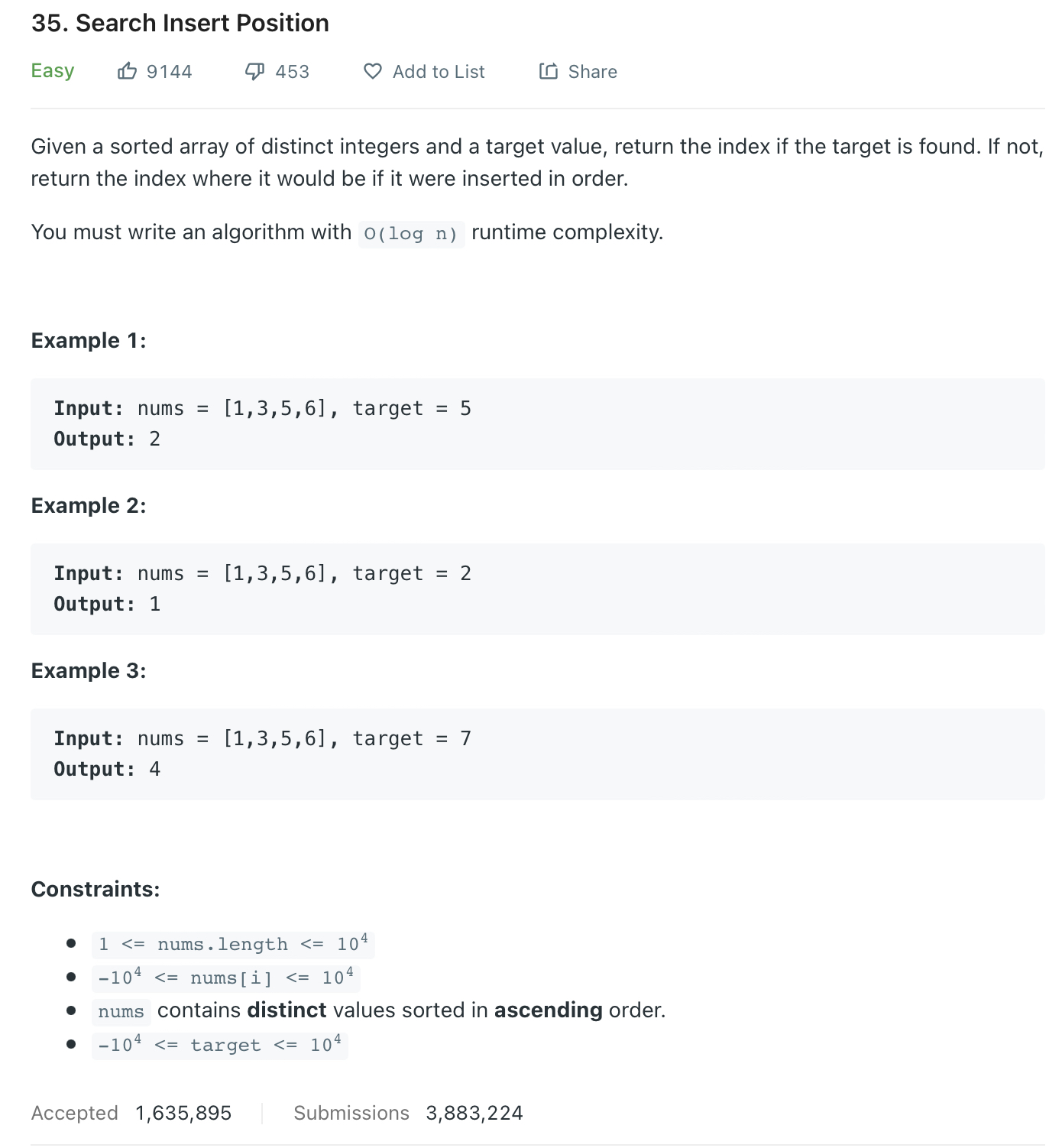 Target 값을 정렬된 배열에 순서에 맞게 넣으려면 몇번째에 넣어야 하는지 그 값을 알아내는 문제 입니다.