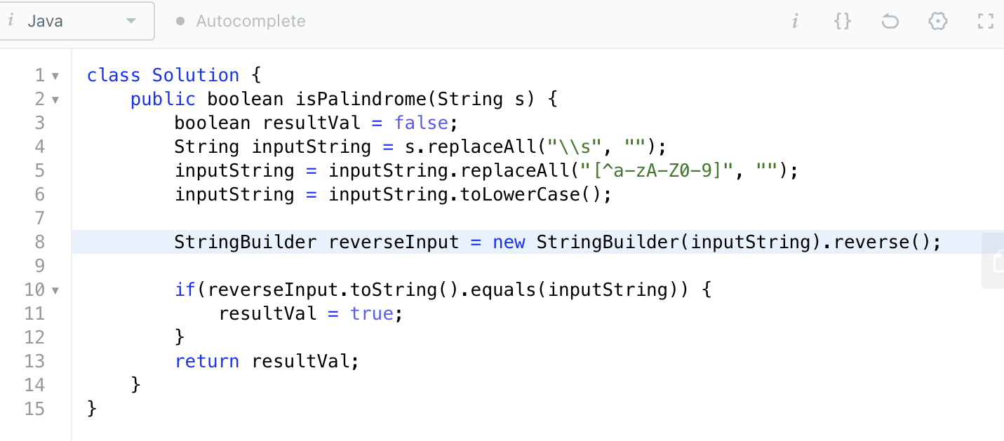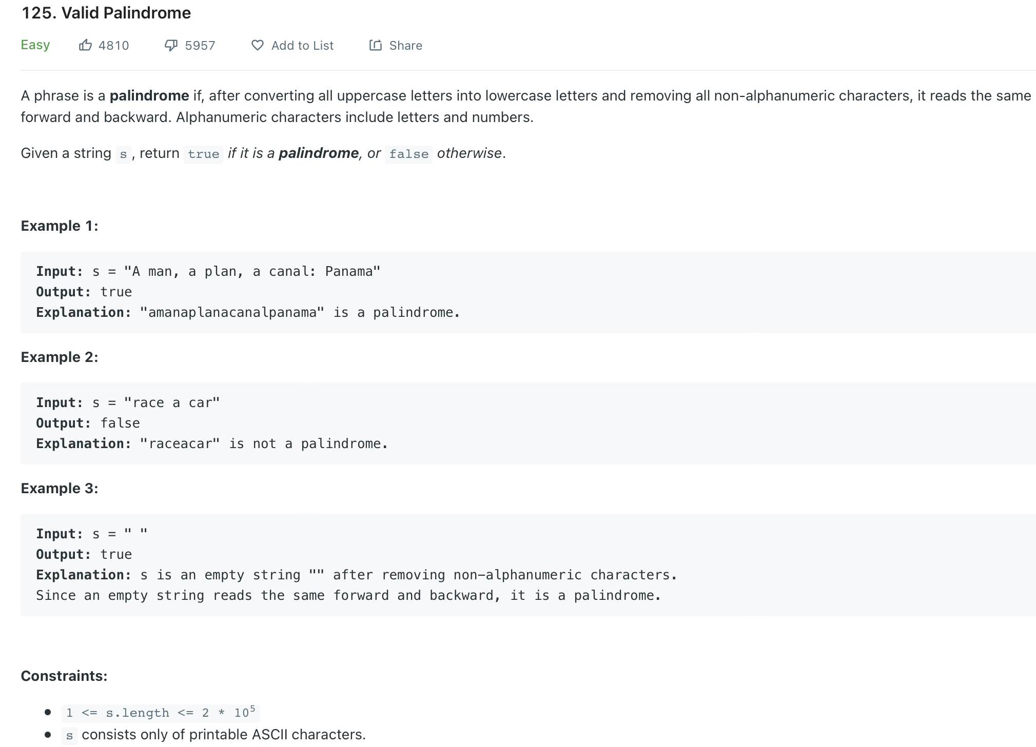 오늘의 문제는 Palindrome인지 여부를 알아보는 건데요. 입력값에서 스페이스와 부호들을 다 빼고 모든 글자를 소문자로 바꾼 후 체크해야 합니다.