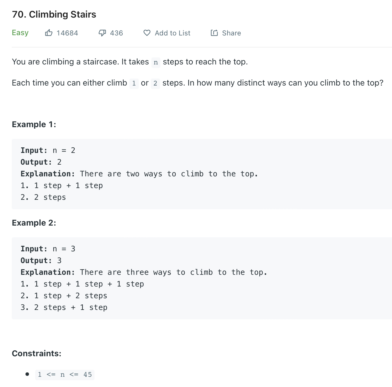 public int climbStairs(int n) {