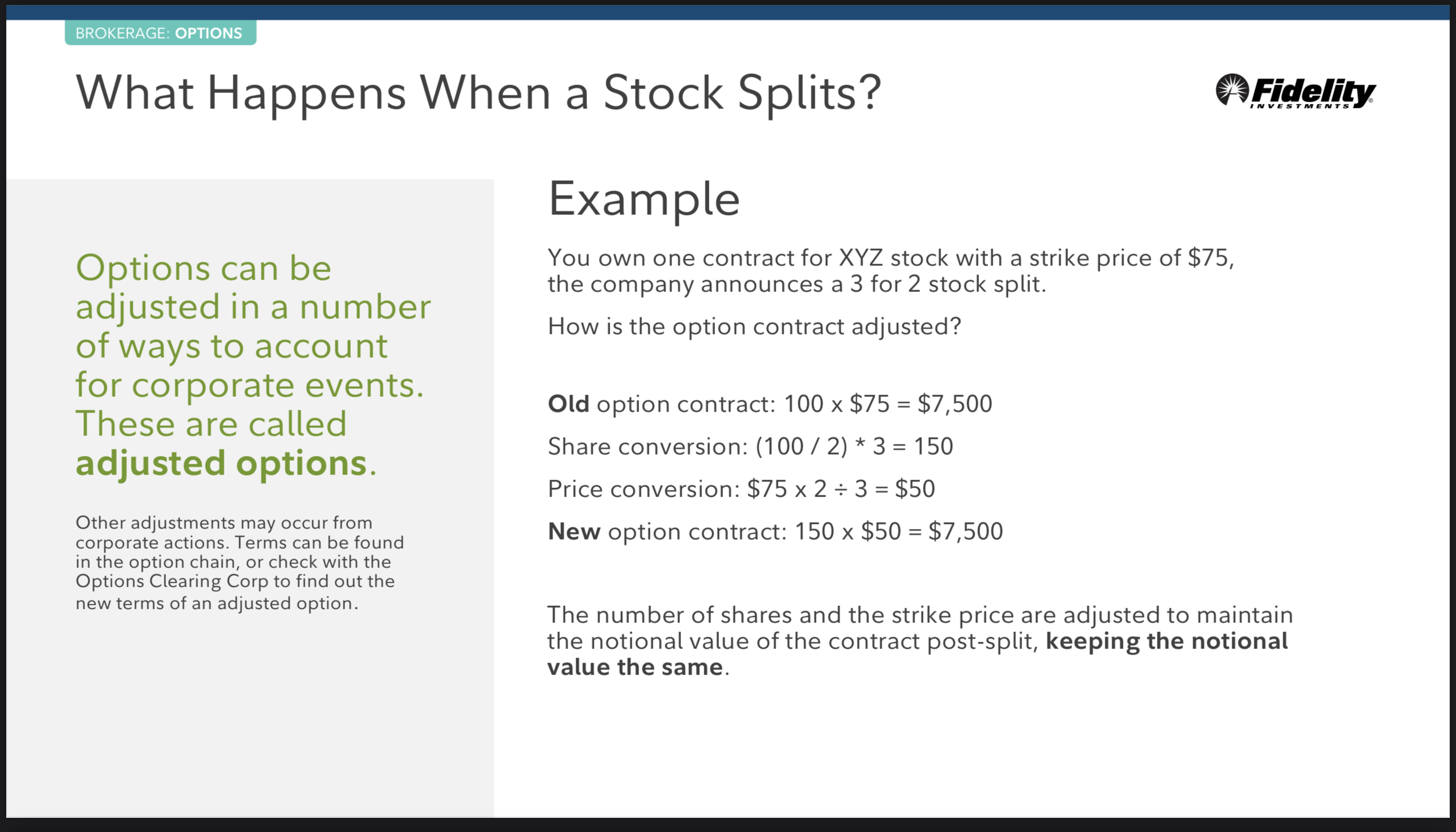예) XYZ주식을 $75불의 strike price로 계약을 했다. 그런데 그 회사가 주식을 2주당 -> 3주로 주식을 분할 하기로 했다고 발표 했다.