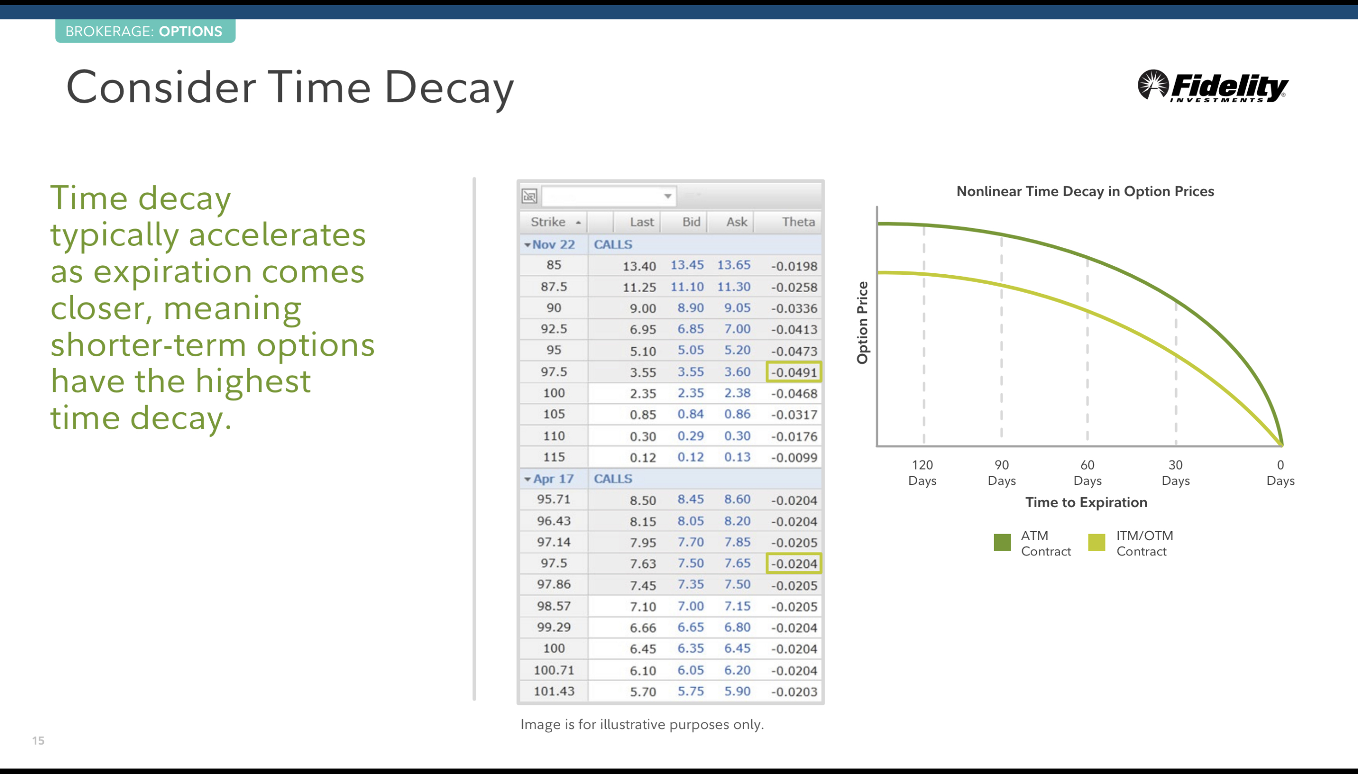 시간 소멸(시간이 지남에 따라 옵션 가격이 하락-혹은 상승- 하는 것)은 일반적으로 만기가 가까워질수록 가속화됩니다. 즉, 단기 옵션의 시간 소멸이 가장 큽니다.