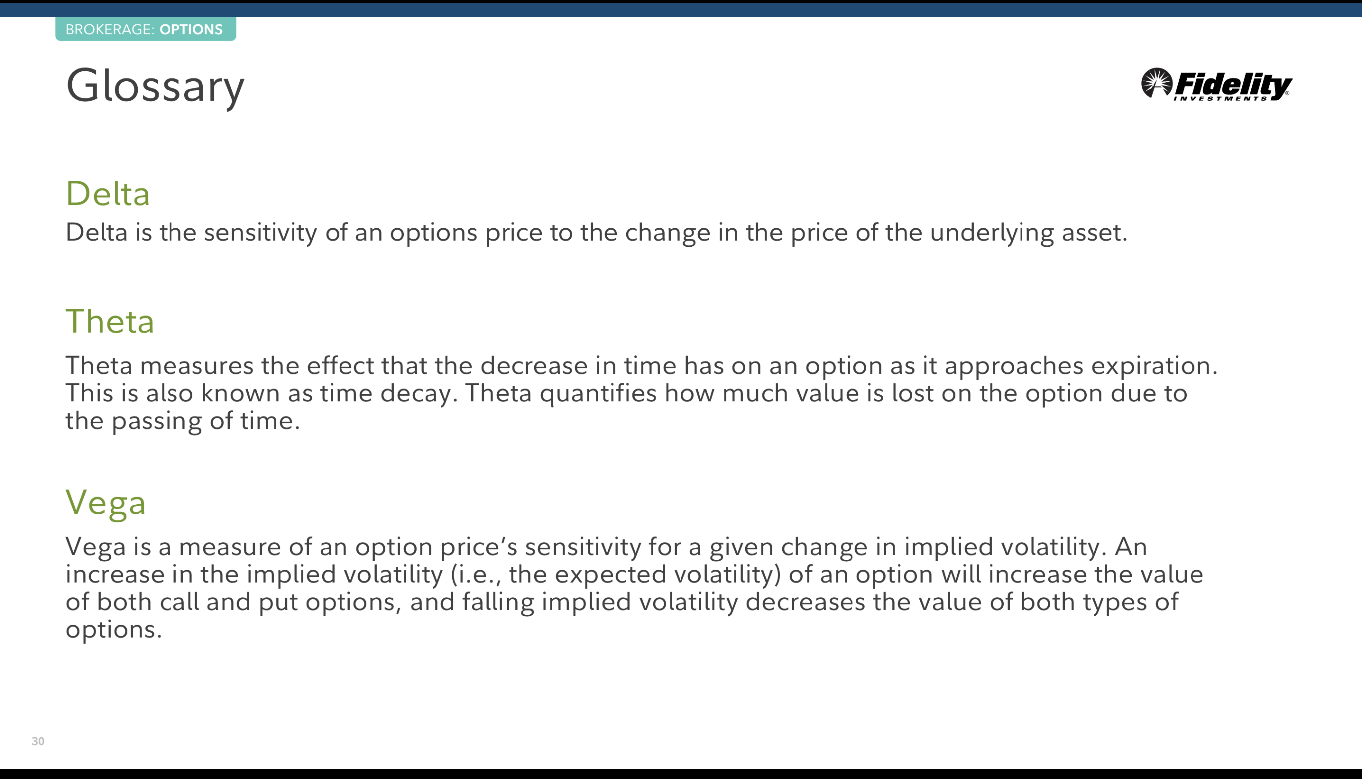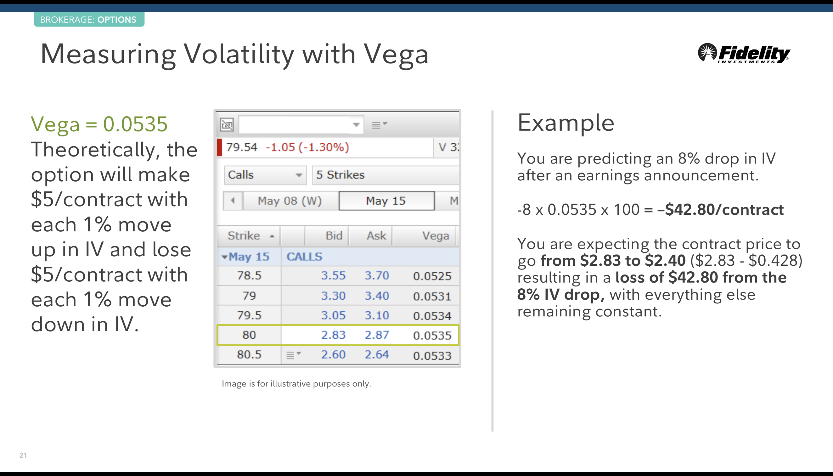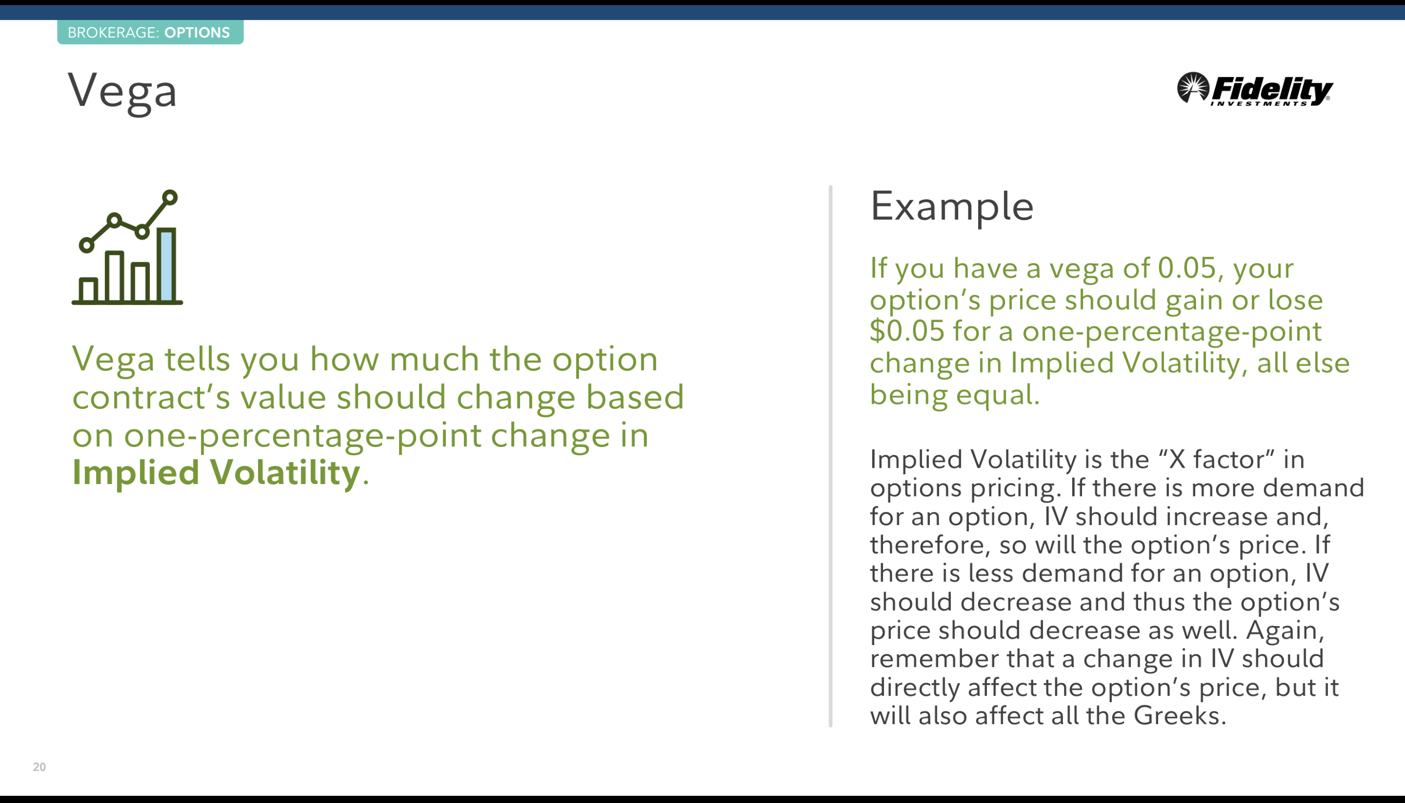 Vega는 내재 변동성의 1% 포인트 변화에 따라 옵션 계약의 가치가 얼마나 변해야 하는지 알려줍니다.