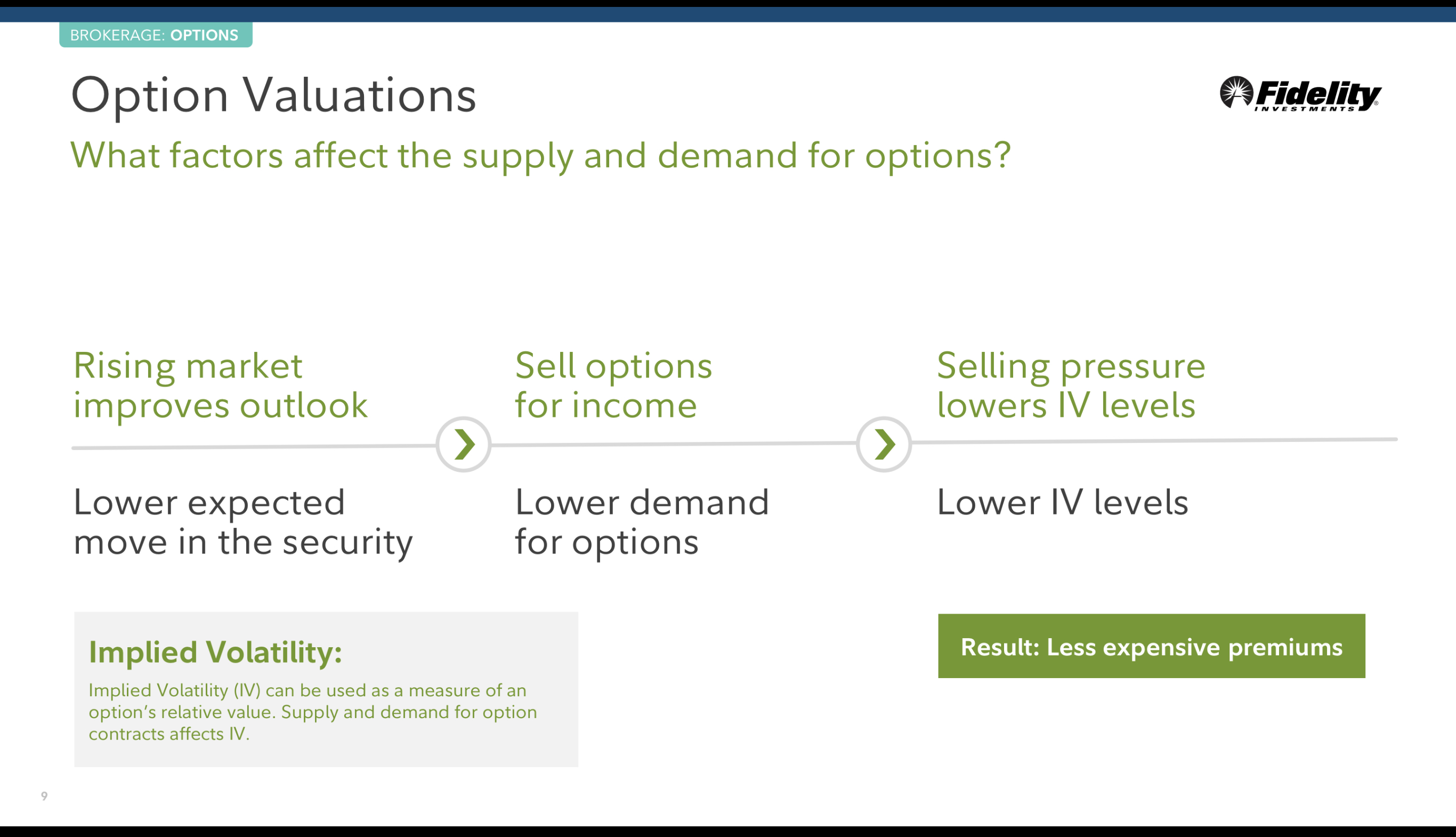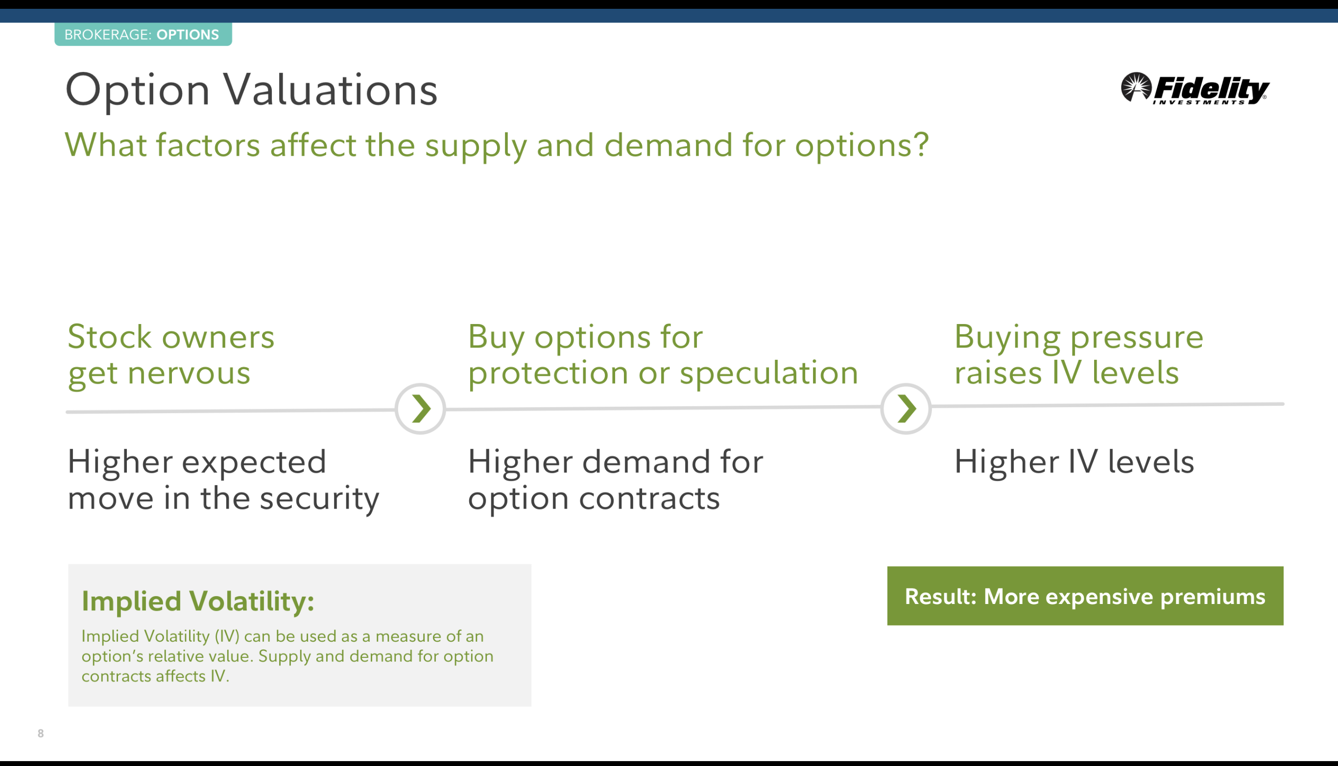 내재 변동성(IV)은 옵션의 상대적 가치를 측정하는 척도로 사용할 수 있습니다. 옵션 계약에 대한 수요와 공급은 IV에 영향을 미칩니다.