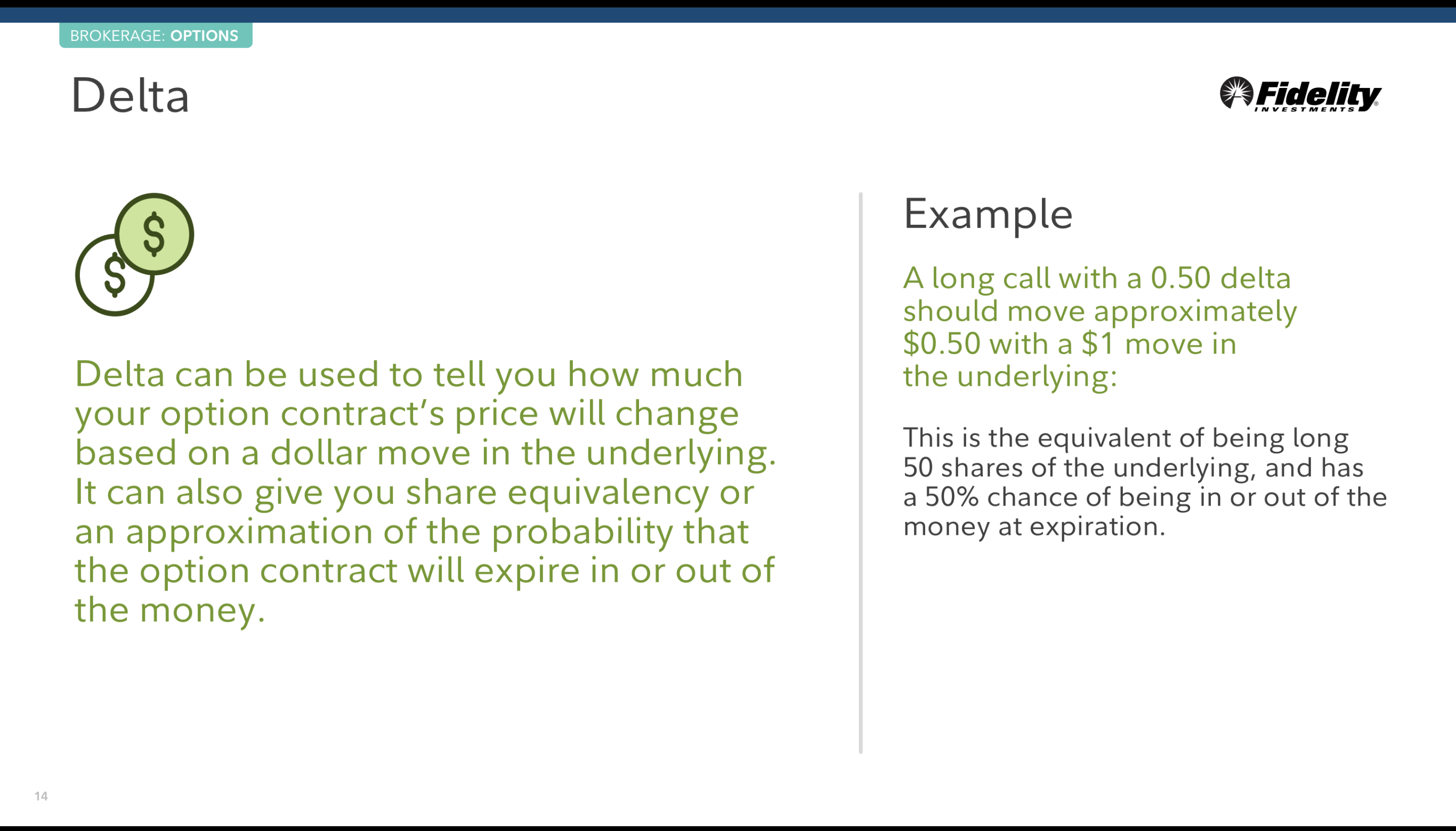 또한 델타는 주식 등가성이나 옵션 계약이 in the money 혹은 out the money 중 어떤 것에서 만료를 맞게 될지에 대한 전망치에대한 근사값을 제공할 수 있다.