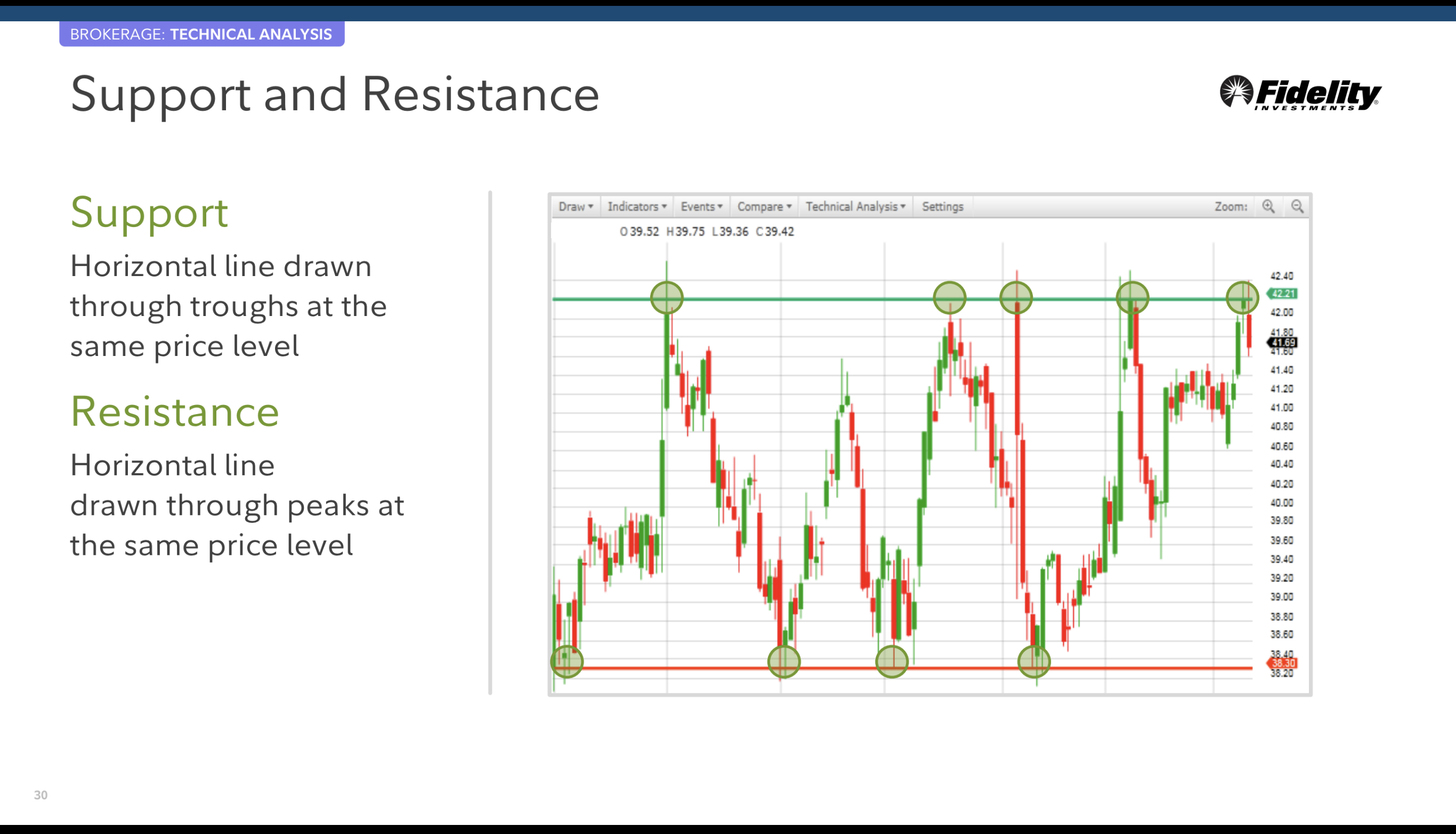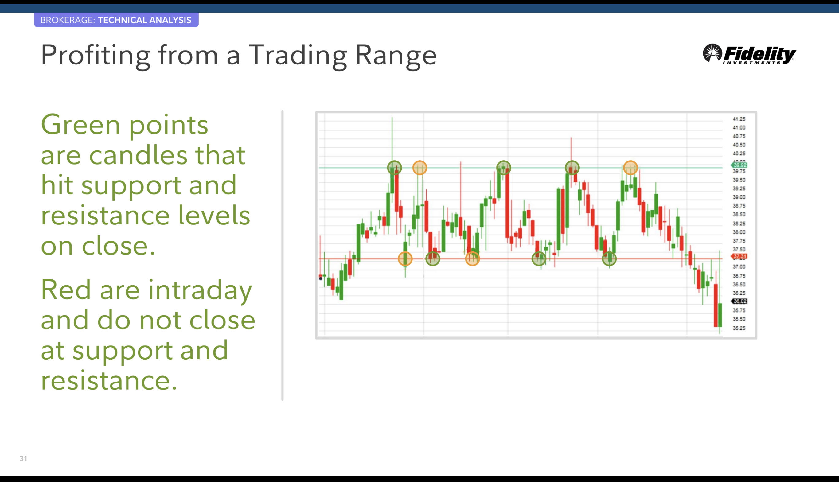 빨간 원들은 장중에 도달한 가격으로 이날은 지지선과 저항선에서 끝나지 않은 거래일을 나타냅니다.