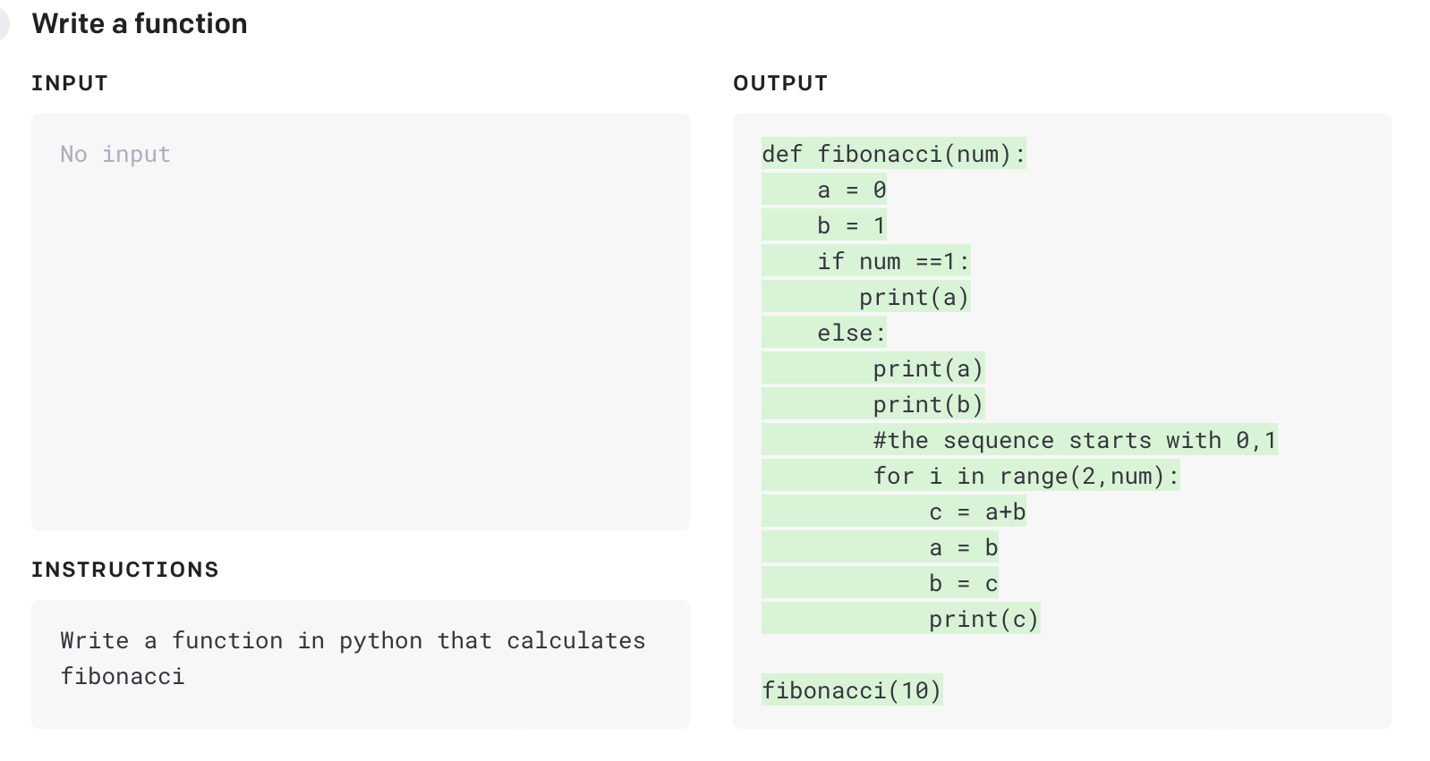 Writing code is often an iterative process that requires refining the text along the way. Editing makes it natural to continuously refine the output of the model until the final result is polished. In this example, we use fibonacci as an example of how to iteratively build upon code.