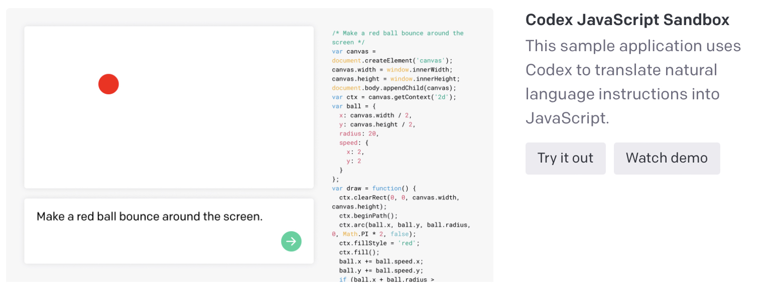 To see Codex in action, check out our Codex JavaScript Sandbox or our other demo videos.