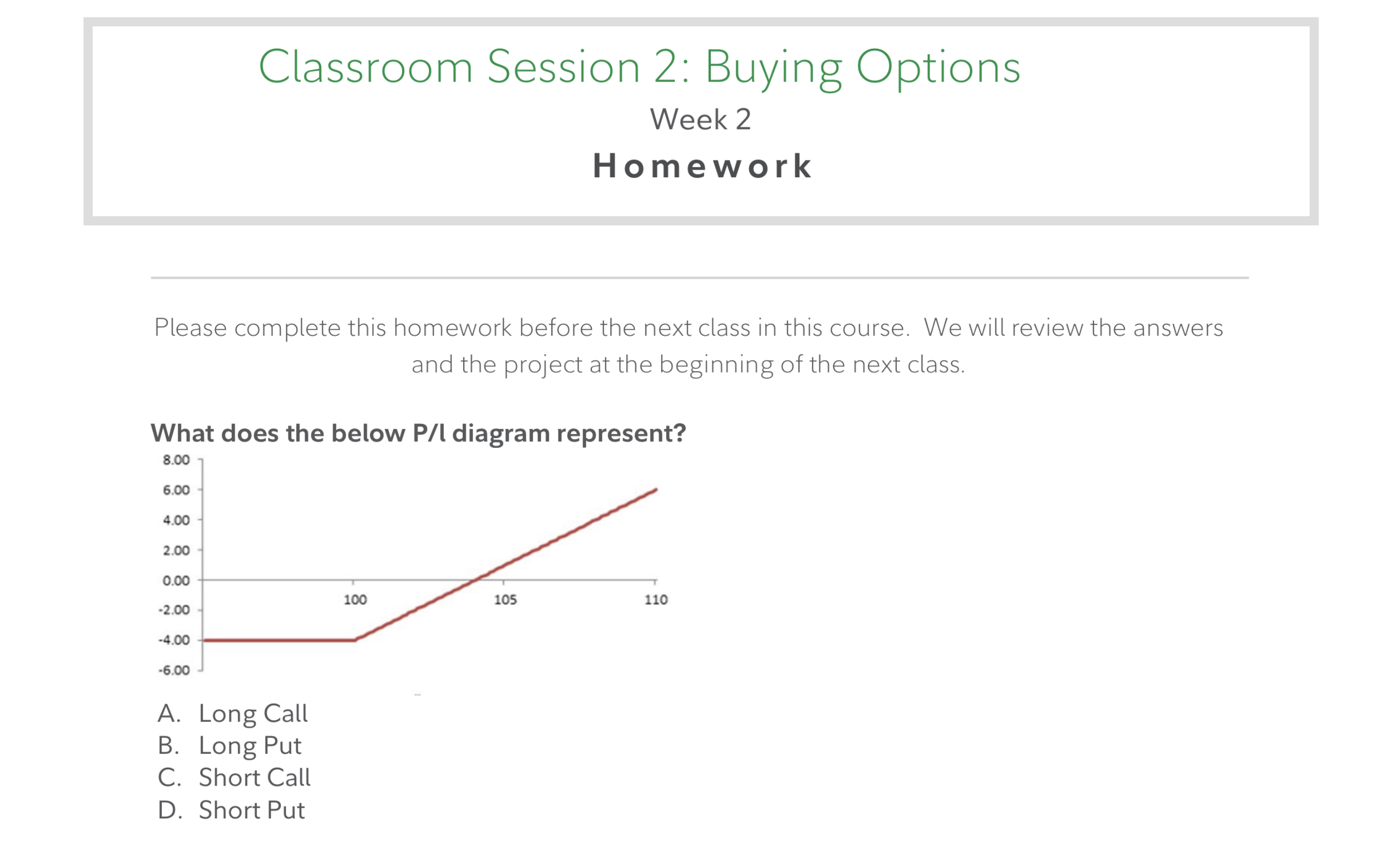 Project: Use the option chain on Fidelity.com and/or ATP and enter an underlying symbol of your choosing. Look up the next monthly expiration and manually calculate the breakeven, max loss, and max gain of buying an at the money call. We will review in prep portion of the class.