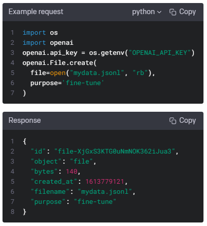 If the purpose is set to "fine-tune", each line is a JSON record with "prompt" and "completion" fields representing your training examples.
