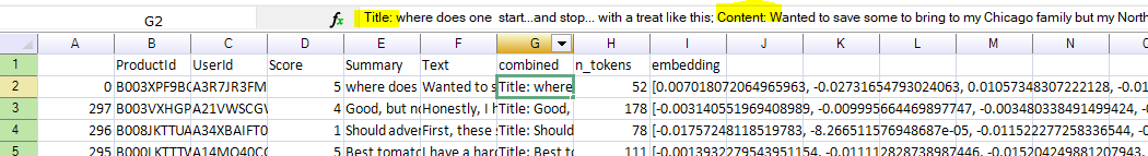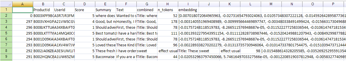 각 리뷰에 대한 productId, UserId, Score, Summary, Text, combined, n_tokens 그리고 embedding 컬럼들이 있습니다.