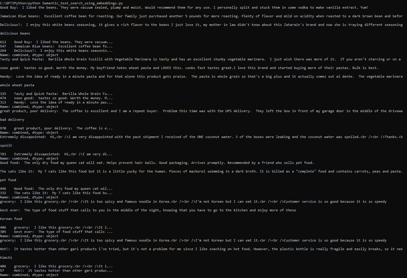 이렇게 해서 대용량 데이터세트 내에서 openai의 임베딩 기능을 통한 Semantic text search 에 대한 예제를 살펴 봤습니다.