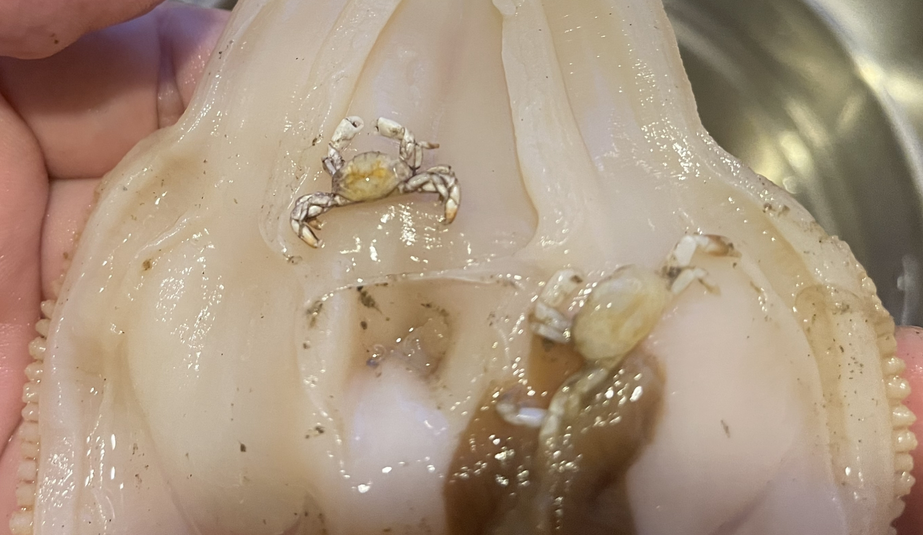 조개를 손질하다 보면 가끔 조그만 새끼 게들이 나오기도 합니다.