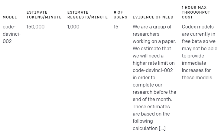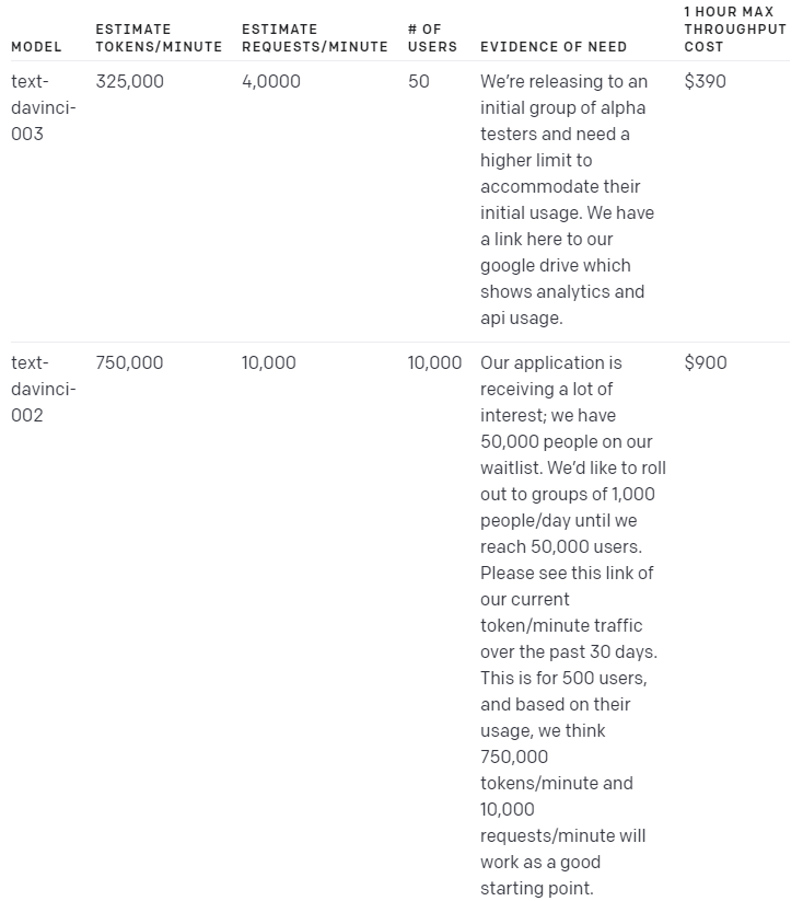 limited rate limits 이 야기할 수 있는 불만을 이해하고 있으며 모든 사람을 위해 기본값을 높이고 싶습니다. 그러나 공유 용량 제약으로 인해 rate limit 증가 요청 양식을 통해 필요성을 입증한 유료 고객에 대해서만 rate limit 증가를 승인할 수 있습니다. 귀하의 필요를 적절하게 평가할 수 있도록 양식의 '필요에 대한 증거 공유' 섹션에서 이전 사용자 활동을 기반으로 현재 사용량 또는 예상에 대한 통계를 제공해 주시기 바랍니다. 이 정보를 사용할 수 없는 경우 단계적 릴리스 접근 방식을 권장합니다. 현재 rate limit으로 사용자 하위 집합에 서비스를 릴리스하고 영업일 기준 10일 동안 사용 데이터를 수집한 다음 검토 및 승인을 위해 해당 데이터를 기반으로 공식적인 rate limit 증가 요청을 제출합니다.