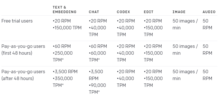 The OpenAI API has separate limits for requests per minute and tokens per minute.