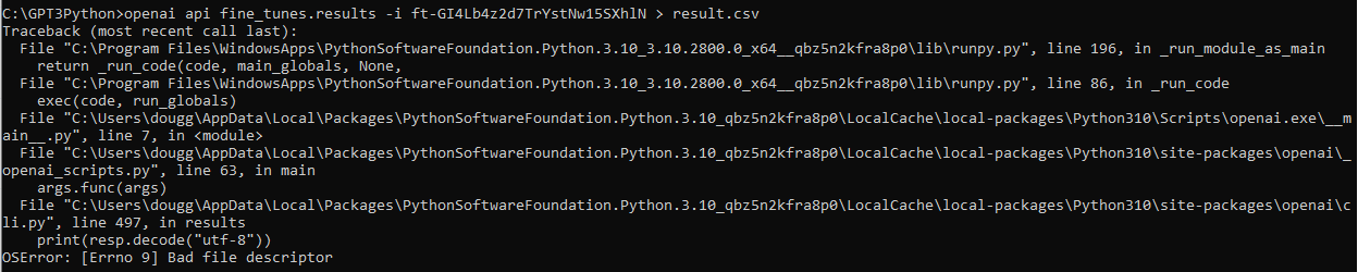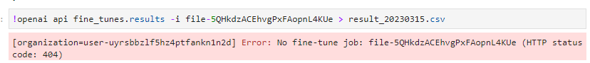 처음엔 result_files에 있는 ID를 넣었더니 No fine-tune job 이라는 에러 메세지가 나오네요.