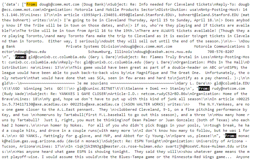 결과의 일 부분인데요. sports_dataset 배열은 첫번째 item 이 data 입니다. 그리고 이 data 안에는 여러 글들이 있습니다. 각 글들은 From: 으로 시작합니다. 첫번째 글은 바로 위에서 출력한 그 글입니다. dougb@comm.mot.com으로 시작해서 708-576-8207 로 끝납니다.
