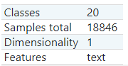 여기에는 20개의 주제들이 있습니다. 그리고 총 샘플들은 18846개가 있고 1차원 배열이고 text로 이뤄져 있습니다.