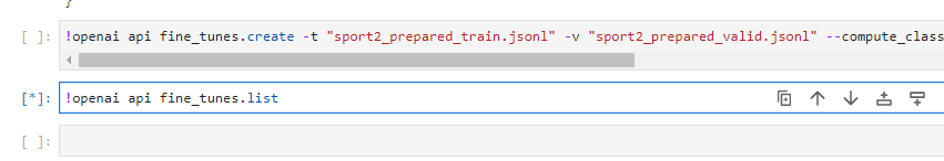 그래서 fine_tunes.create을 다시 해 봤습니다. 새로운 모델을 생성해서 해 보려구요.