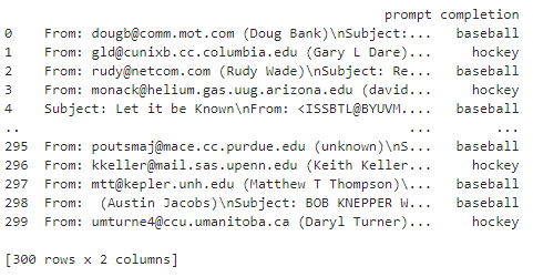 아래 예제는 ada 모델을 이용해서 이메일 내용을 보고 이게 Baseball과 연관 돼 있는지 아니면 Hockey와 연관 돼 있는 건지 GPT-3 가 인지할 수 있도록 Fine-Tuning을 사용해서 훈련시키고 새로운 모델을 만드는 과정을 보여 줍니다.