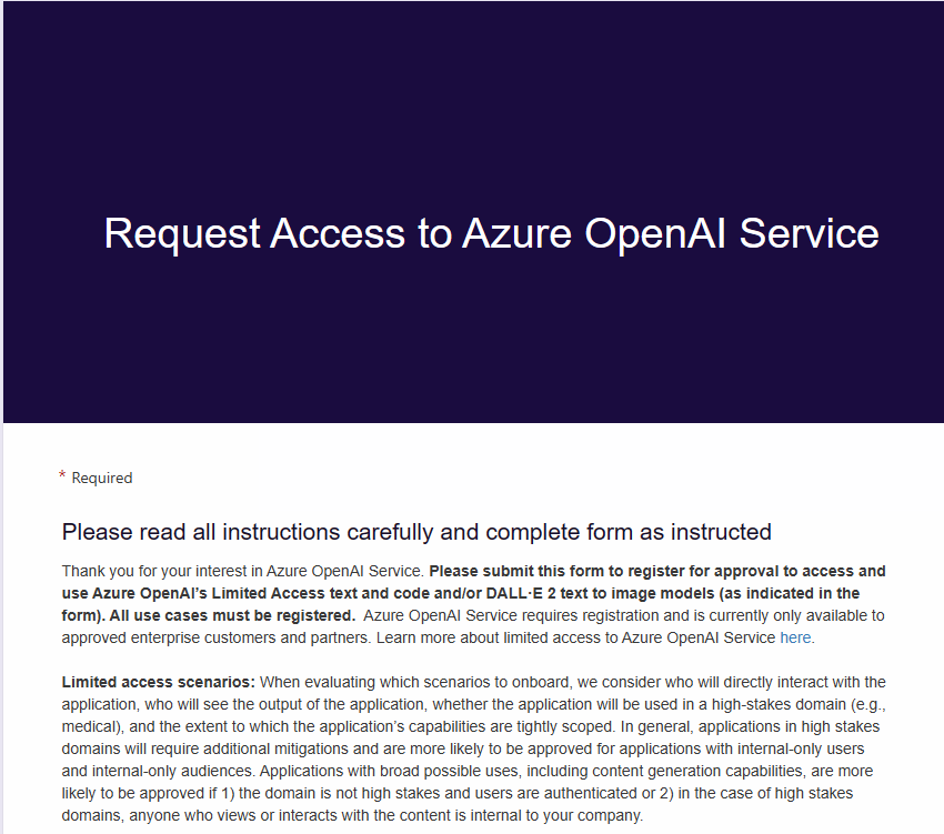 Azure OpenAI Service is currently available to customers via an application form. The selected subscription has not been enabled for use of the service and does not have quota for any pricing tiers. Click here to request access to Azure OpenAI service.
