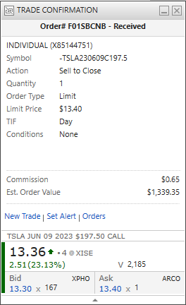 Sell to Close를 선택하고 1 Contract에 Order Type은 Limit 그리고 Limit Price는 13.40을 적어 냈다.