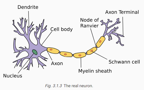 아래 그림은 dendrites (수상돌기, input terminals), the nucleus(핵, CPU), the axon (축삭, output wire) 그리고 axon terninals (축삭 단자, 출력 단자)로 구성된 synapses를 통해 다른 뉴런에 연결할 수 있는 biological neuron을 그린 것입니다.