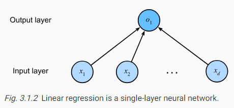 The inputs are x1,…,xd. We refer to d as the number of inputs or the feature dimensionality in the input layer. The output of the network is o1. Because we are just trying to predict a single numerical value, we have only one output neuron. Note that the input values are all given. There is just a single computed neuron. In summary, we can think of linear regression as a single-layer fully connected neural network. We will encounter networks with far more layers in later chapters.