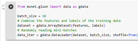 자체 반복자를 작성하는 대신 프레임워크에서 기존 API를 호출하여 데이터를 로드할 수 있습니다. 이전과 마찬가지로 특성 X와 레이블 y가 있는 데이터 세트가 필요합니다. 그 외에도 내장 데이터 로더에서 배치_크기를 설정하고 셔플링 예제를 효율적으로 처리하도록 했습니다.