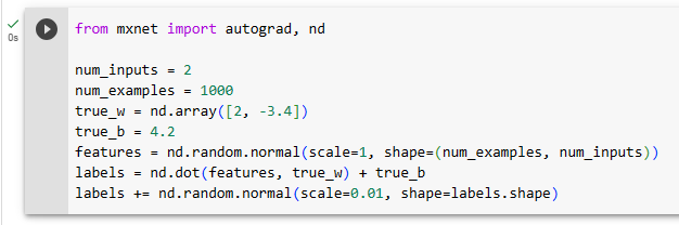 For this example, we will work in low dimension for succinctness. The following code snippet generates 1000 examples with 2-dimensional features drawn from a standard normal distribution. The resulting design matrix X belongs to ℝ **1000×2. We generate each label by applying a ground truth linear function, corrupting them via additive noise ϵ , drawn independently and identically for each example: