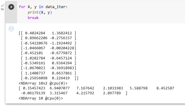 While seemingly innocuous, the invocation of iter(data.train_dataloader()) illustrates the power of Python’s object-oriented design. Note that we added a method to the SyntheticRegressionData class after creating the data object. Nonetheless, the object benefits from the ex post facto addition of functionality to the class.