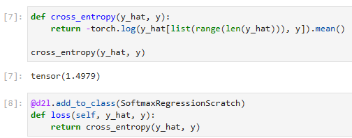 결과적으로, cross_entropy(y_hat, y)는 예측값 y_hat과 실제 레이블 y를 이용하여 크로스 엔트로피 손실을 계산한 결과를 반환합니다.