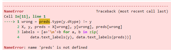 - wrong = preds.type(y.dtype) != y: 모델의 예측값 preds와 정답 레이블 y를 비교하여 잘못 예측된 샘플을 식별합니다. preds.type(y.dtype)를 사용하여 preds의 데이터 타입을 y와 일치시키고, != 연산자를 사용하여 예측값과 정답 레이블을 비교합니다. 이 결과를 wrong에 저장합니다.