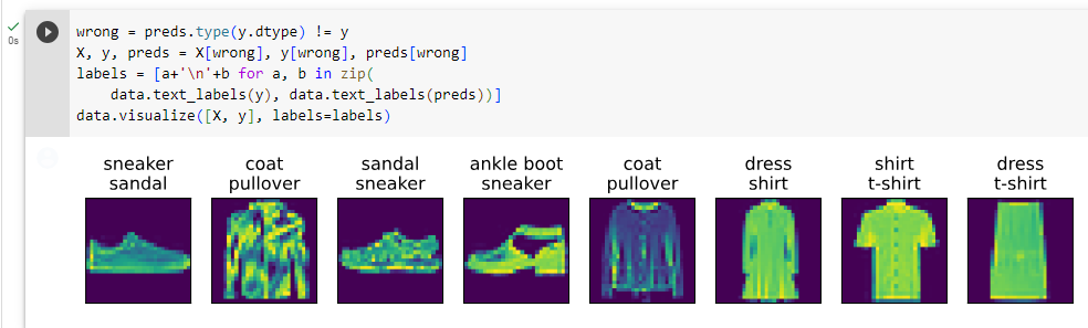 - labels = [a+'\n'+b for a, b in zip(data.text_labels(y), data.text_labels(preds))]: 잘못 예측된 샘플들에 대한 정답 레이블 y와 예측값 preds를 사용하여 레이블 텍스트를 생성합니다. data.text_labels(y)와 data.text_labels(preds)를 순회하면서 정답 레이블과 예측값을 합쳐서 하나의 문자열로 만들고, 이를 labels 리스트에 저장합니다.